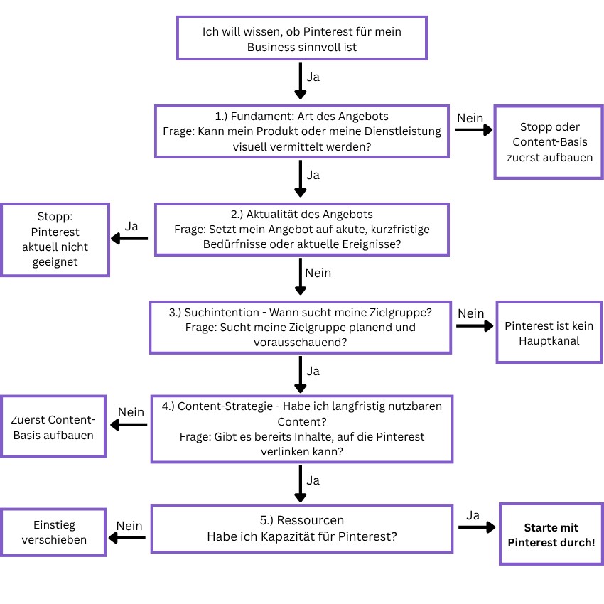 Kurz: Wenn du bei fast allen Punkten „Ja“ ankreuzt — starte mit Pinterest. Bei einzelnen „Nein“-Antworten: zuerst Content‑Basis, visuelle Kernbotschaft oder Kapazität aufbauen, dann loslegen.