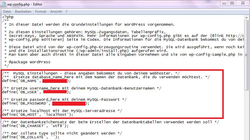 ‚putyournamehere‘ ersetzen Sie durch den Datenbanknamen und ‚usernamehere‘ durch den Nutzernamen der Datenbank. Das Passwort der Datenbank setzen Sie bei ‚youpasswordhere’ ein. Bei All-Inkl.com können Sie in der vierten Zeile ‚localhost‘ unverändert lassen. Behalten Sie die Anführungszeichen und unbedingt auch die Groß- und Kleinschreibung bei, damit es später nicht zu Fehlermeldungen kommt.